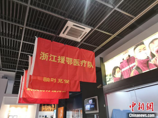 展厅内的浙江援鄂医疗队旗帜。 张煜欢 摄